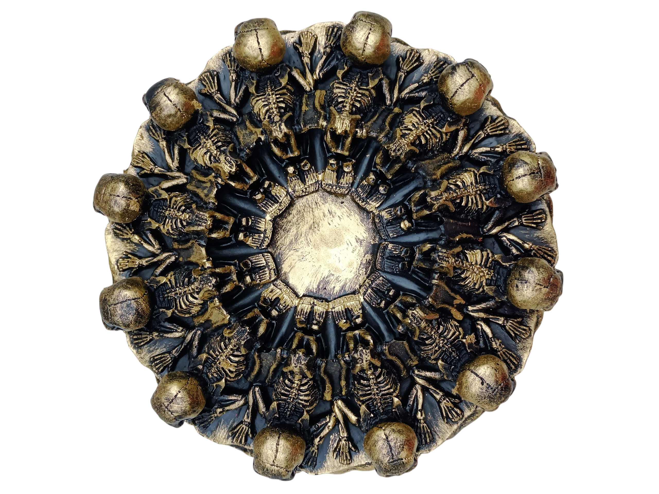Szukasz oryginalnego dodatku, który wyróżni się w każdym wnętrzu? Ta popielniczka zdobiona motywem czaszek i szkieletów to idealny wybór dla osób ceniących niebanalne wzornictwo. Ręcznie wykończone detale, postarzana faktura oraz złote przetarcia nadają jej unikalny, mroczny charakter.